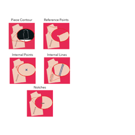 The photo digitizer can automatically extract the pattern contour, using precise Bezier curves, can identify corners and mark it as reference points, can identify different type of notches (marked or cutted), internal points and internal lines. By convention, the longest internal line found will be declared as grain axis. When the patterns are created inside the office,it is usefull to respect some standard marking procedures, avoiding any manual adjustement of the digitizing results.